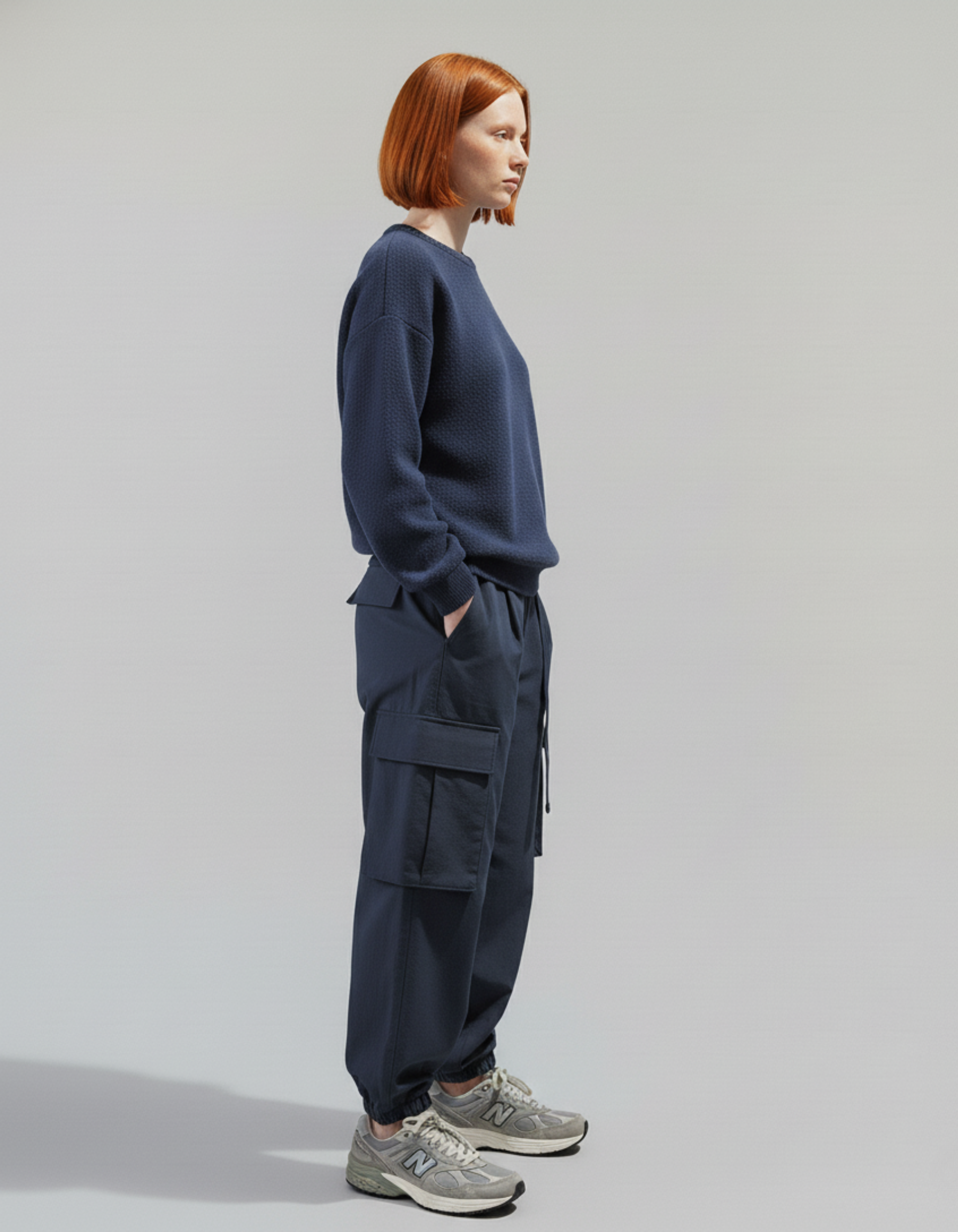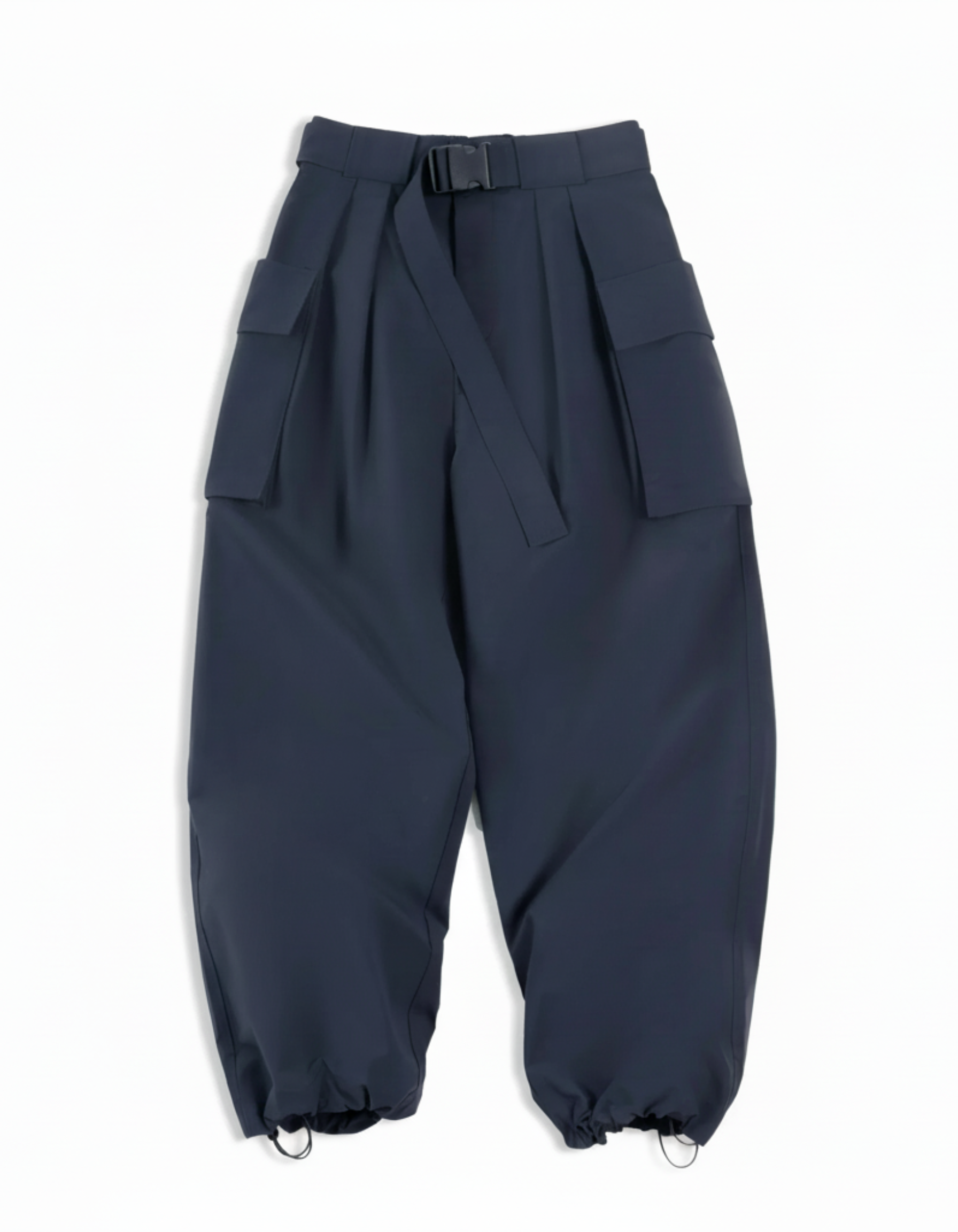 Cut in a relaxed tapered silhouette with functional flap pockets and a built-in tonal belt. The elastic hem and clean seams enhance its architectural shape, creating a structured yet fluid look. It embodies understated streetwear — refined, intentional, and ready for movement.