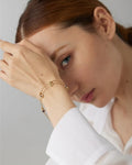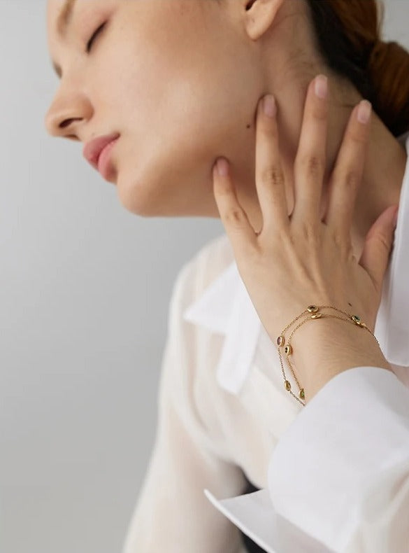 Two thin chains dotted with small discs wrap around the wrist in a gentle rhythm. Gold-plated with colorful accents—or a flawless silver finish—for a modern, understated finish.