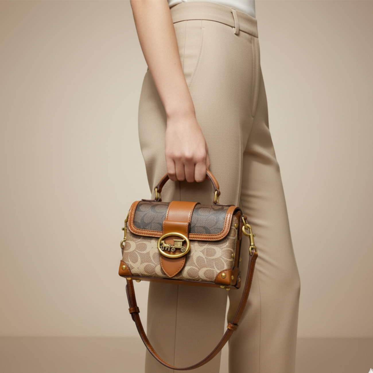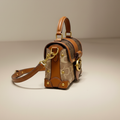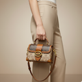 A structured silhouette with a tactile play of textures. The dual-tone composition in tan and deep mocha creates visual depth, while antique-gold accents lend understated opulence.
