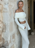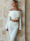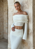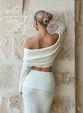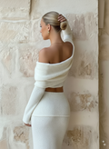 Effortless elegance in motion — this two-piece set features an off-shoulder long-sleeve top and a body-skimming maxi skirt, balancing structure and softness for a refined yet sensual appeal.