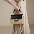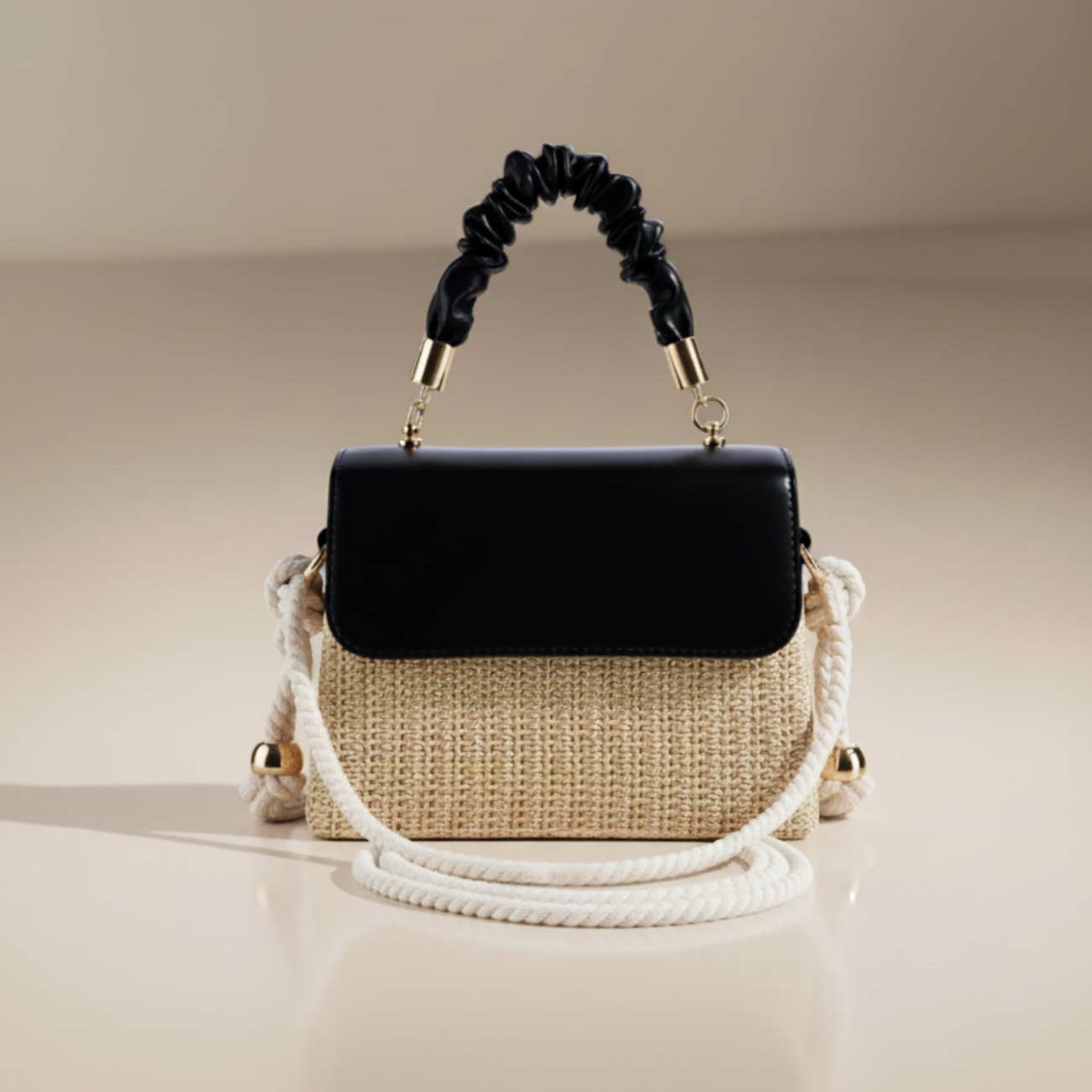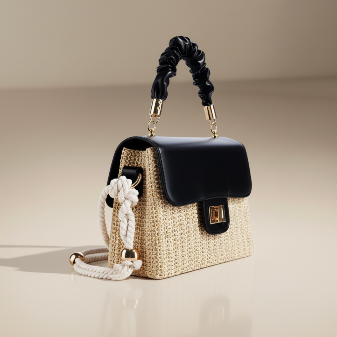 This sculpted silhouette combines tactile warmth with a contemporary edge. The woven body contrasts beautifully with the black leather flap, while the ruched top handle adds a statement of refined individuality.