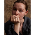 Sleek double-band silhouette with a low profile; mirror-polished surfaces; comfort-fit inner curve. The interlocked form gives dimension without bulk and stacks cleanly with plain bands or signets.