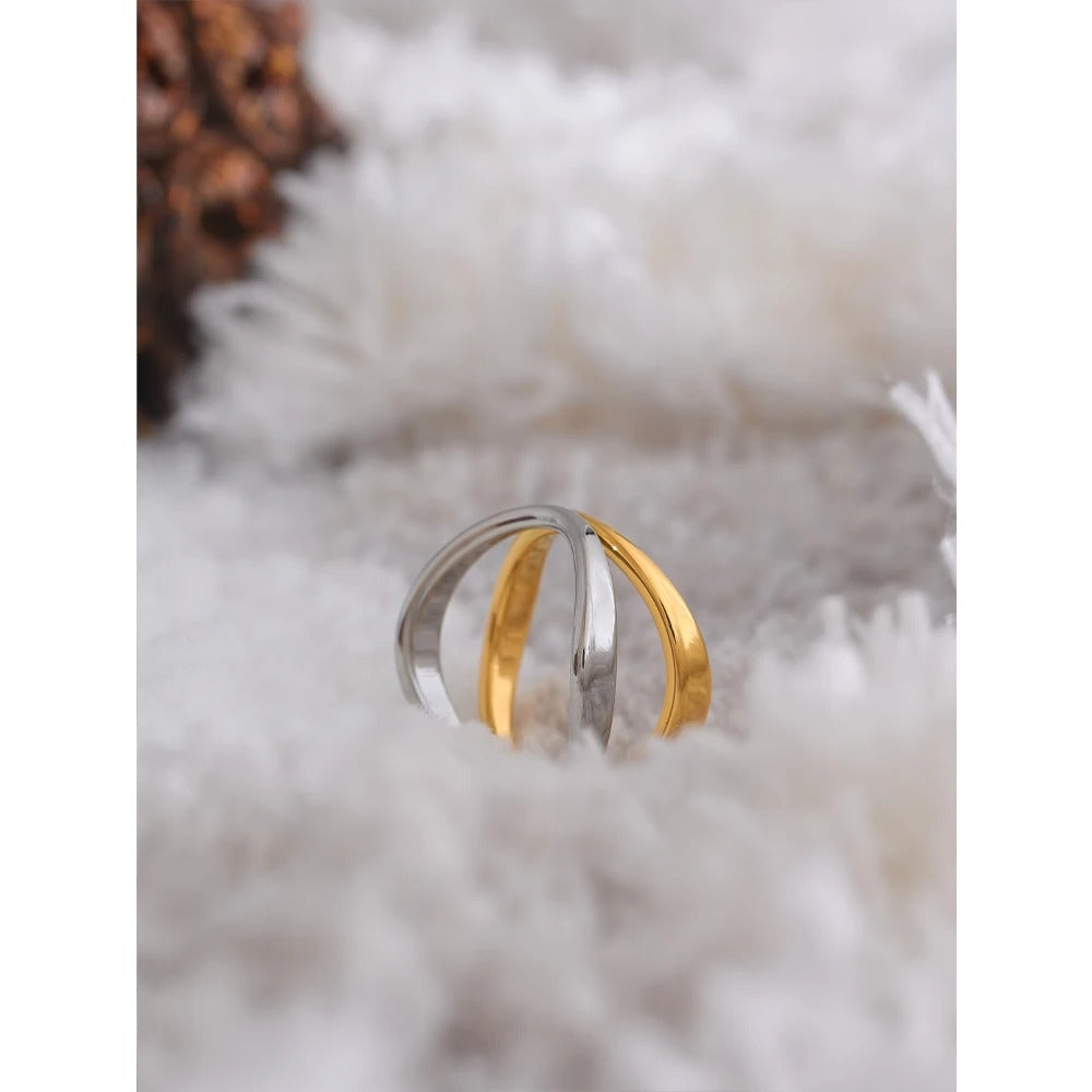 316L stainless steel base with PVD 18K gold plating on one band and rhodium-tone finish on the other. Hypoallergenic, nickel-safe and resistant to tarnish and everyday wear.