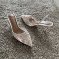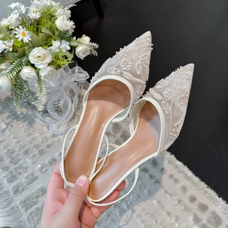 A pointed-toe slingback enhanced with hand-embroidered floral motifs and beaded accents. The slim adjustable strap ensures a secure fit while maintaining lightness and femininity.