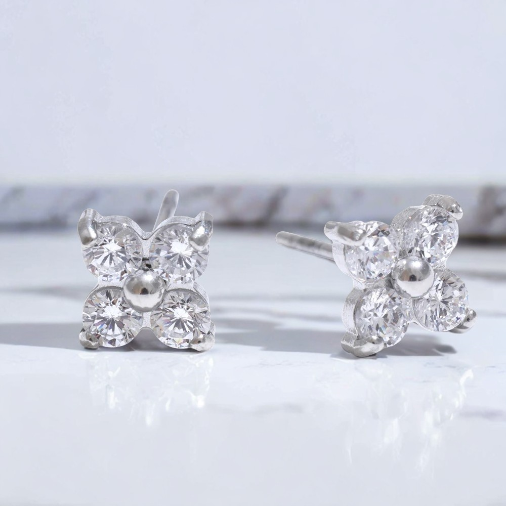 Gold-plated studs with a four-crystal floral glow—clean, luminous, quietly provocative.