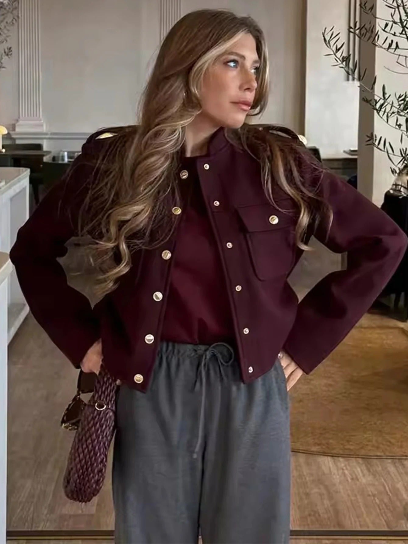 foi criada para quem busca sofisticação com atitude. Inspirada em cortes militares, apresenta elegantes botões metálicos e bolsos utilitários que equilibram estilo atemporal com funcionalidade. O tecido estruturado proporciona um ajuste firme, valorizando a silhueta com requinte moderno.