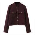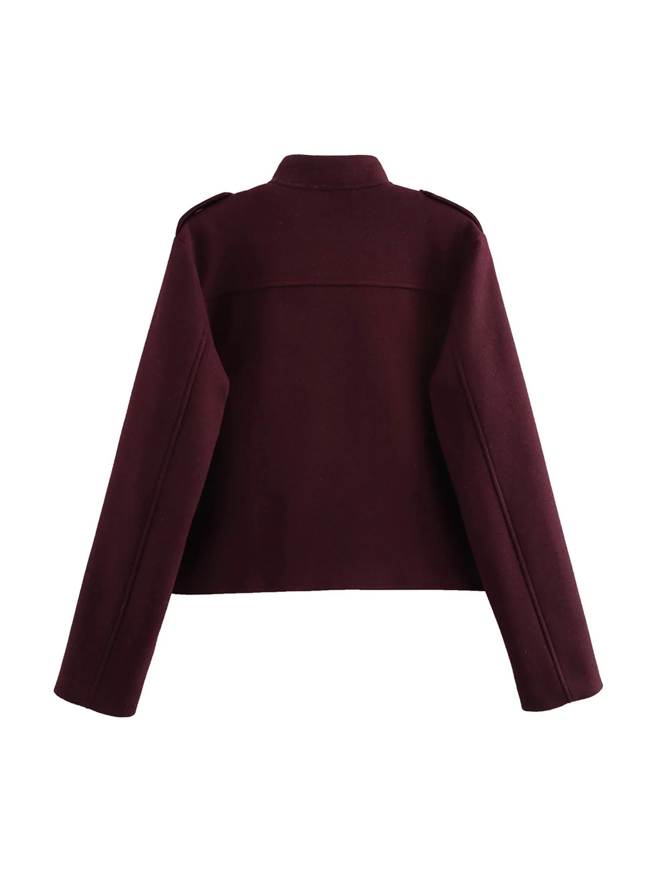 Design: Jaqueta estruturada com gola minimalista e fecho em botões metálicos