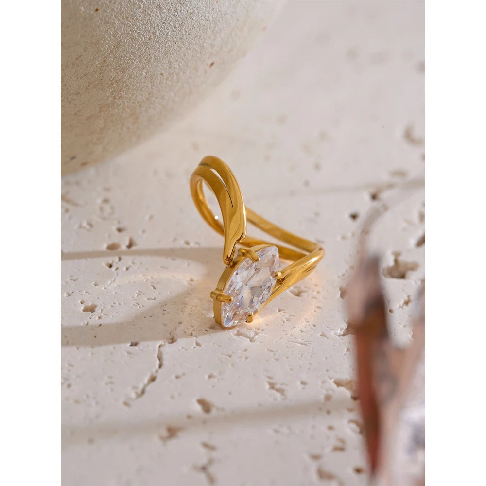 Quiet heat, marquise spark. A fluid split shank in gold-plated metal frames a faceted marquise stone that catches the light with every move—sleek, luminous, effortlessly alluring.