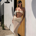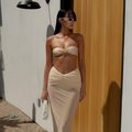 Completing the set, the sheer maxi sarong skirt drapes fluidly over the body, creating a soft, elongated line that elevates the entire look with airy sophistication.