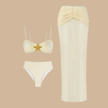 Where coastal elegance meets understated sensuality. This three-piece bikini set captures the essence of refined beachwear — luminous, sculpted and effortlessly feminine.