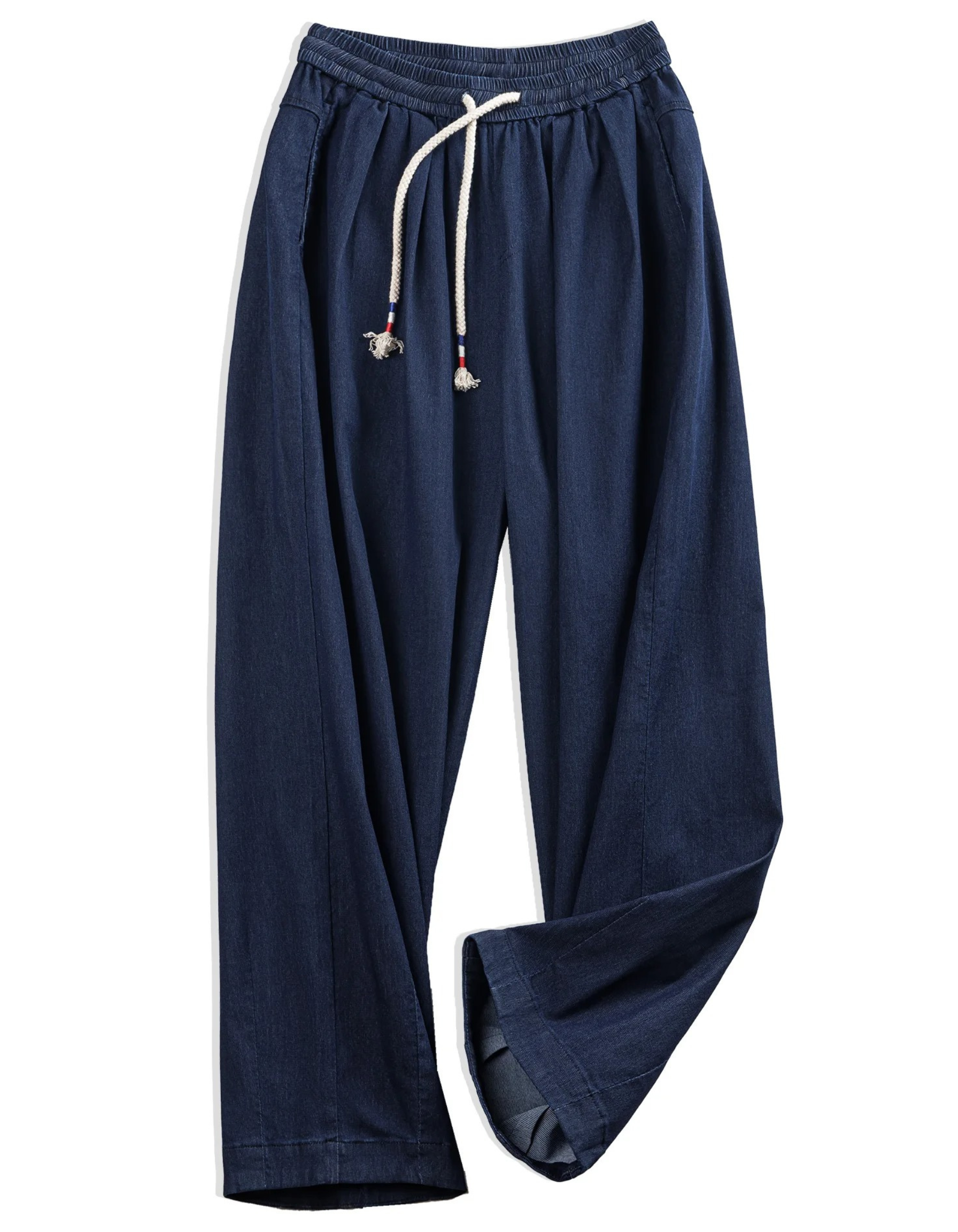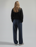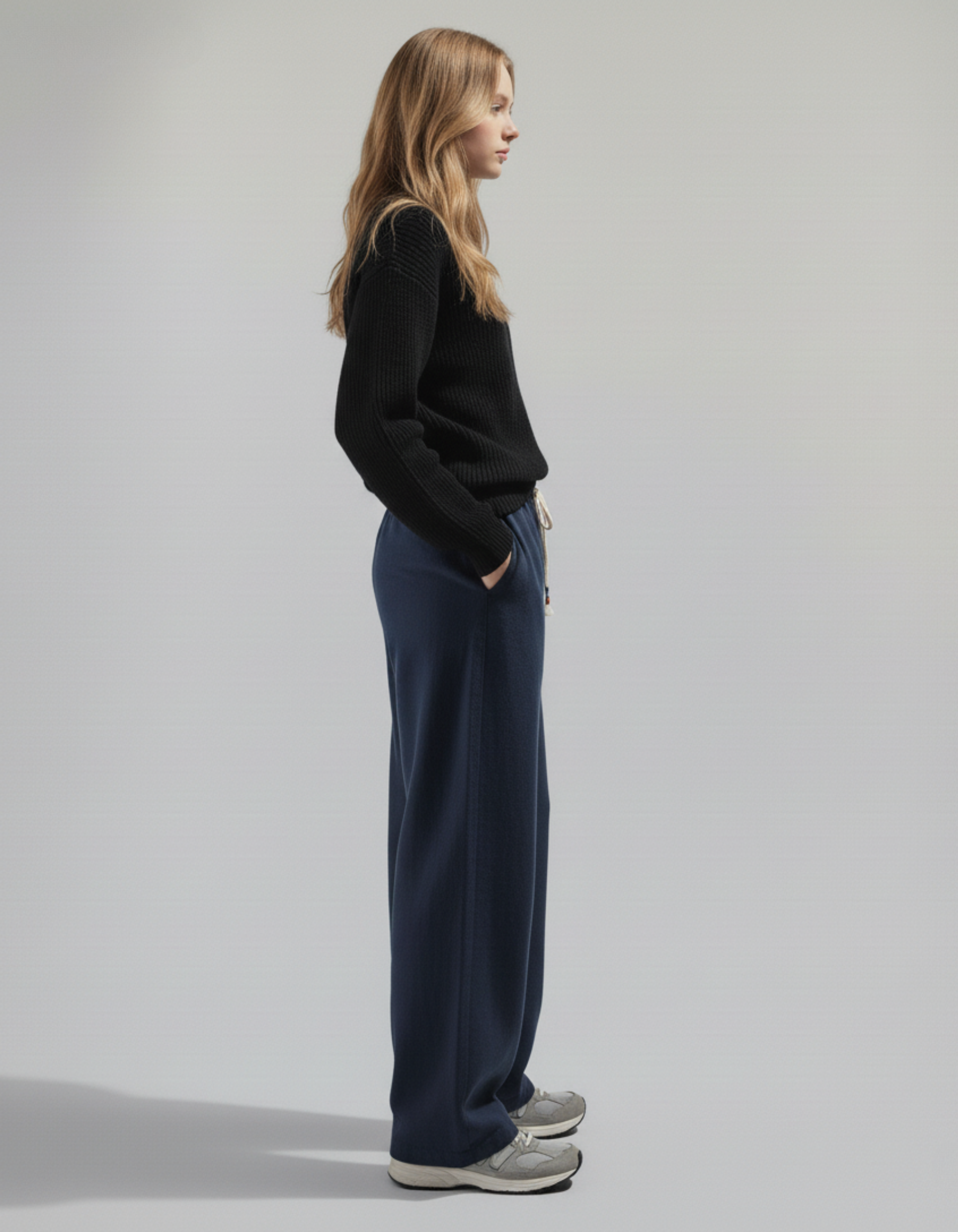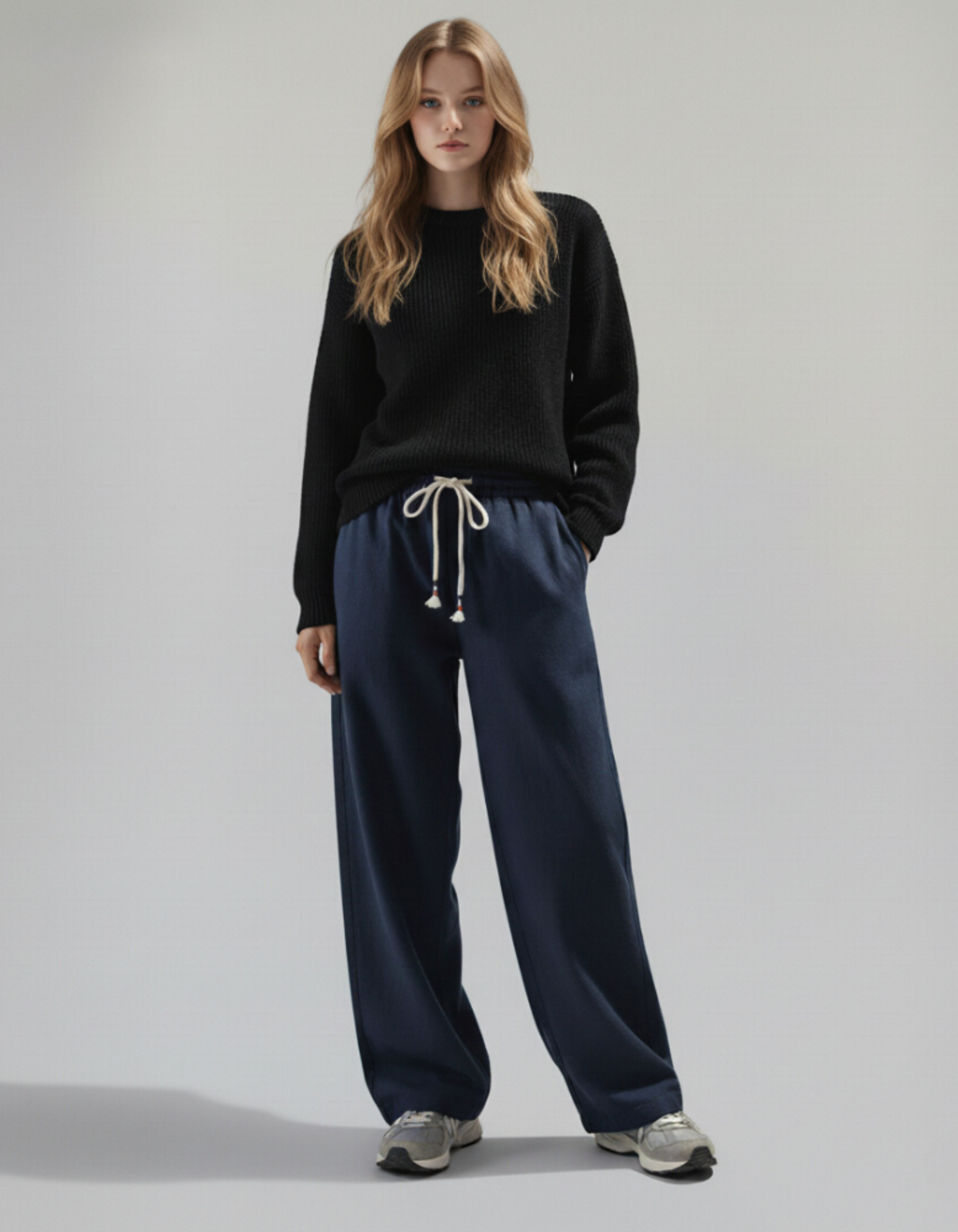 Cut in a wide-leg profile, these pants drape naturally with subtle volume and flow. The elastic waistband with a contrasting drawstring introduces a refined street element, balancing ease with intention. The deep navy tone enhances its understated presence — a nod to modern urban uniformity.