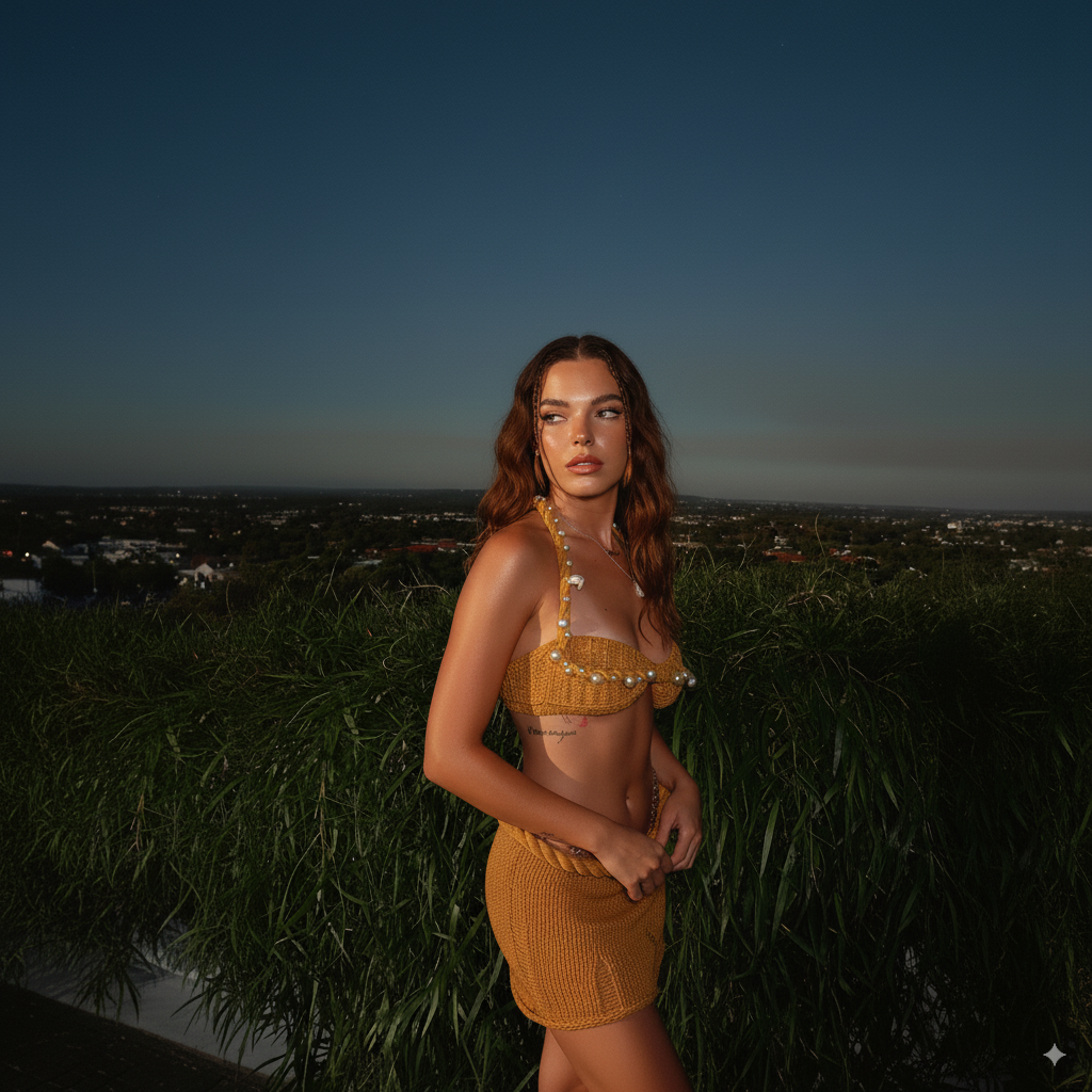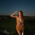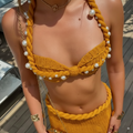 Effortless seduction meets resort luxury — this sculpted duo pairs a pearl-trimmed crochet bikini top with a curve-hugging mini skirt in a golden hue. Designed to captivate, it moves from sunlit lounges to twilight soirées with understated sensuality.