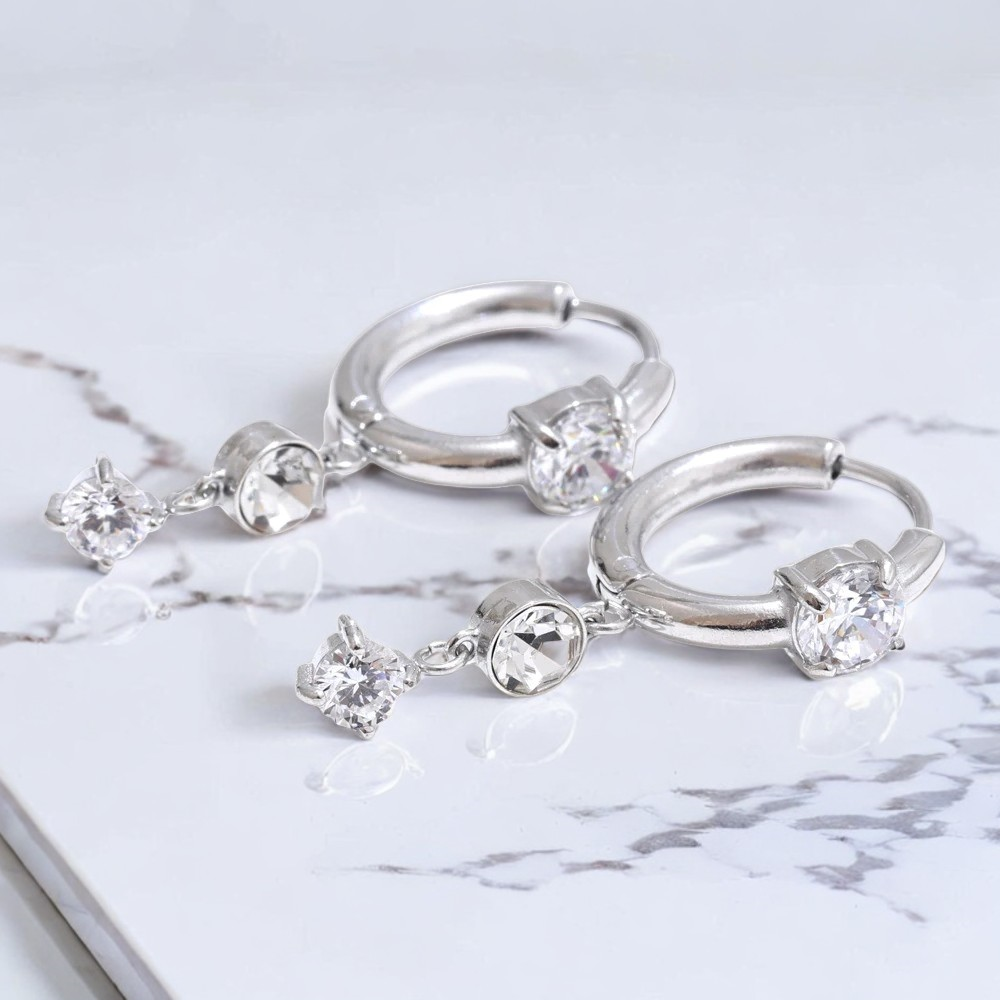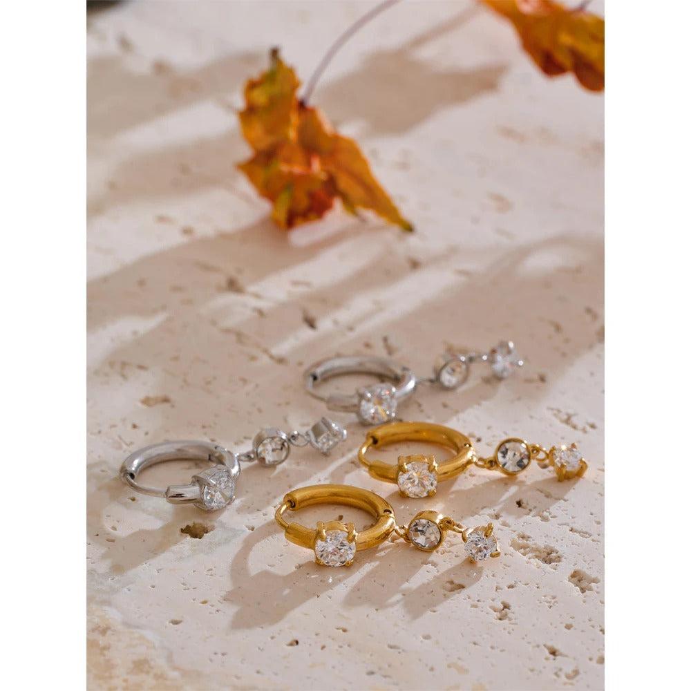 Sculpted huggies, three sparks of light with a hint of heat. A front-set round stone and two slender drops flirt with every move—sleek, luminous, effortlessly alluring.