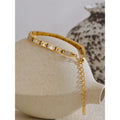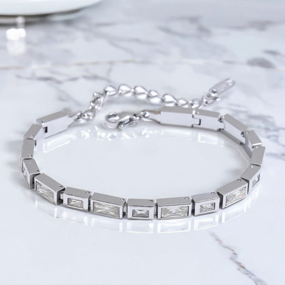 Architectural brilliance, softened by clean lines. Thin rectangular links with clear stones contour the wrist in a refined rhythm; a discreet extender completes the custom fit—modern, luminous, and practical.