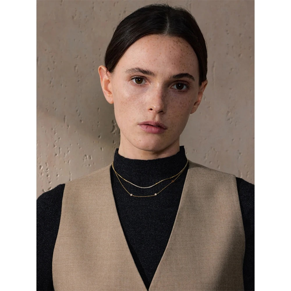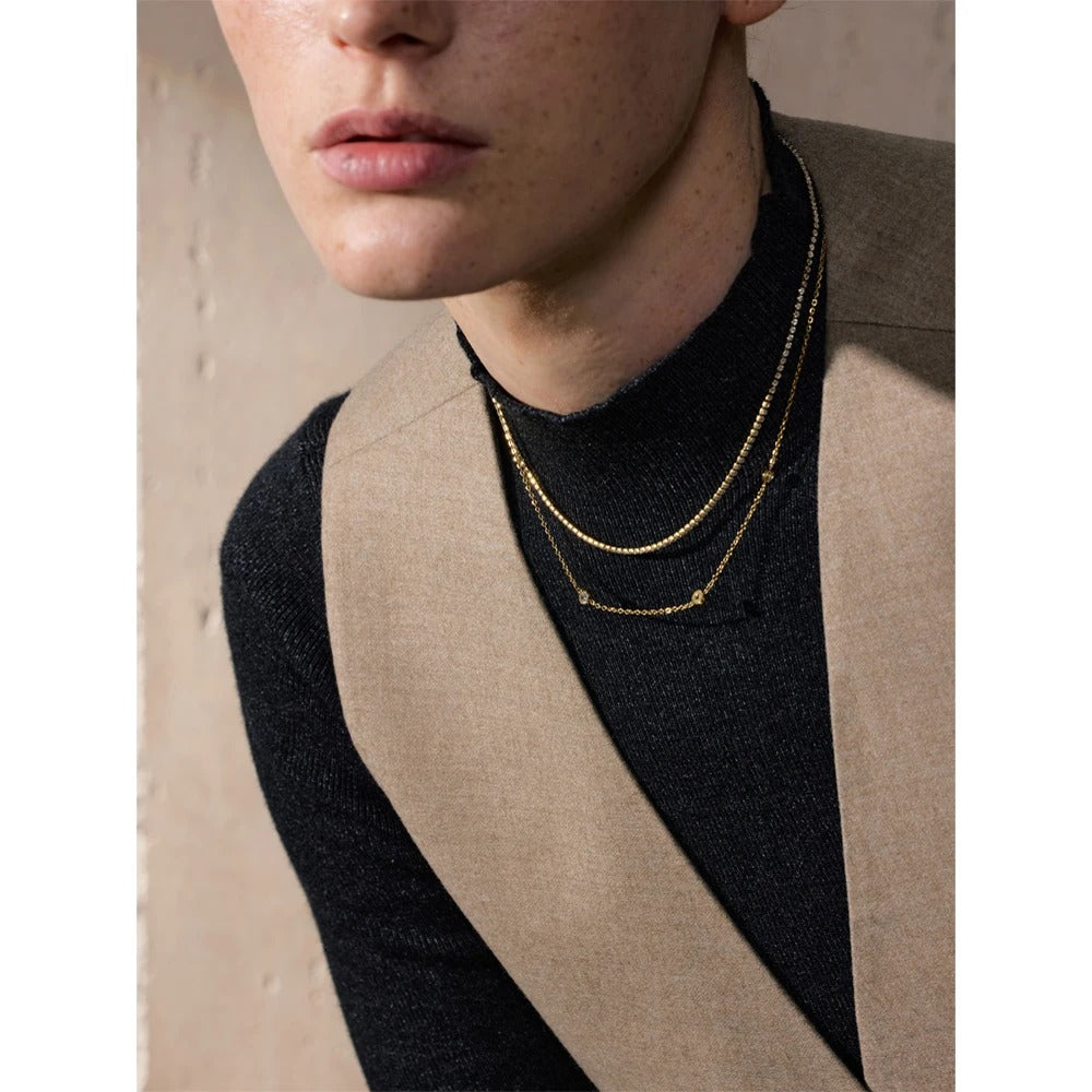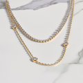 Two layers, one quiet blaze. A sleek tennis line paired with a delicate station chain in gold- or silver-plated metal—clean sparkle, modern heat, effortlessly alluring.
