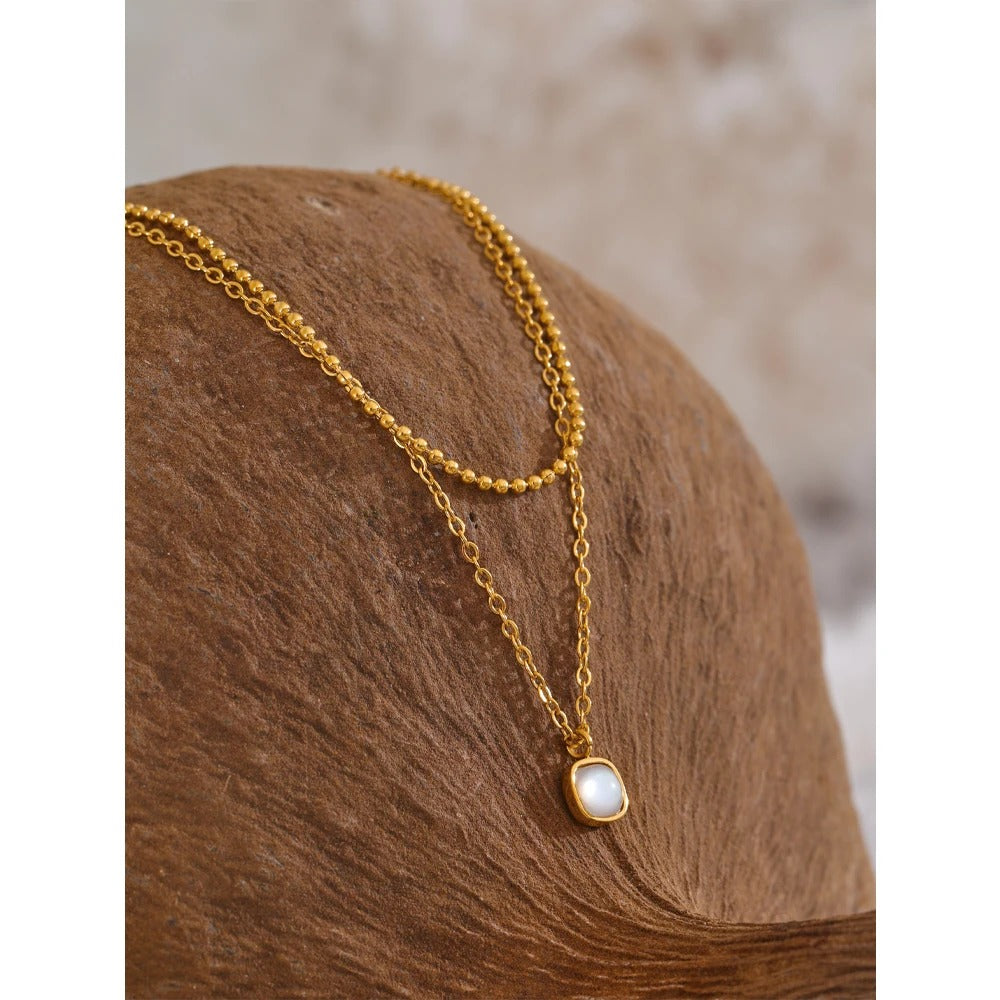 Two layers, a whisper of light. A strand of microbeads and a thin gold-plated metal chain, finished with a polished quartz pendant—light, luminous, and naturally seductive.