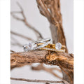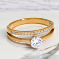 Understated warmth, double the sparkle. A split band in gold- or silver-plated metal holds a precise round crystal solitaire, while a line of pavé defines the other side—clean, luminous, and elegantly seductive.