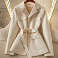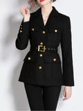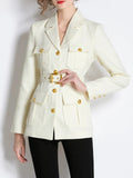 Designed for women who appreciate refined sophistication, this blazer merges timeless tailoring with modern details. Structured shoulders, double front pockets, and a belted waistline sculpt the silhouette with authority and charm. Golden buttons add a luminous touch, making this piece a statement of effortless luxury.