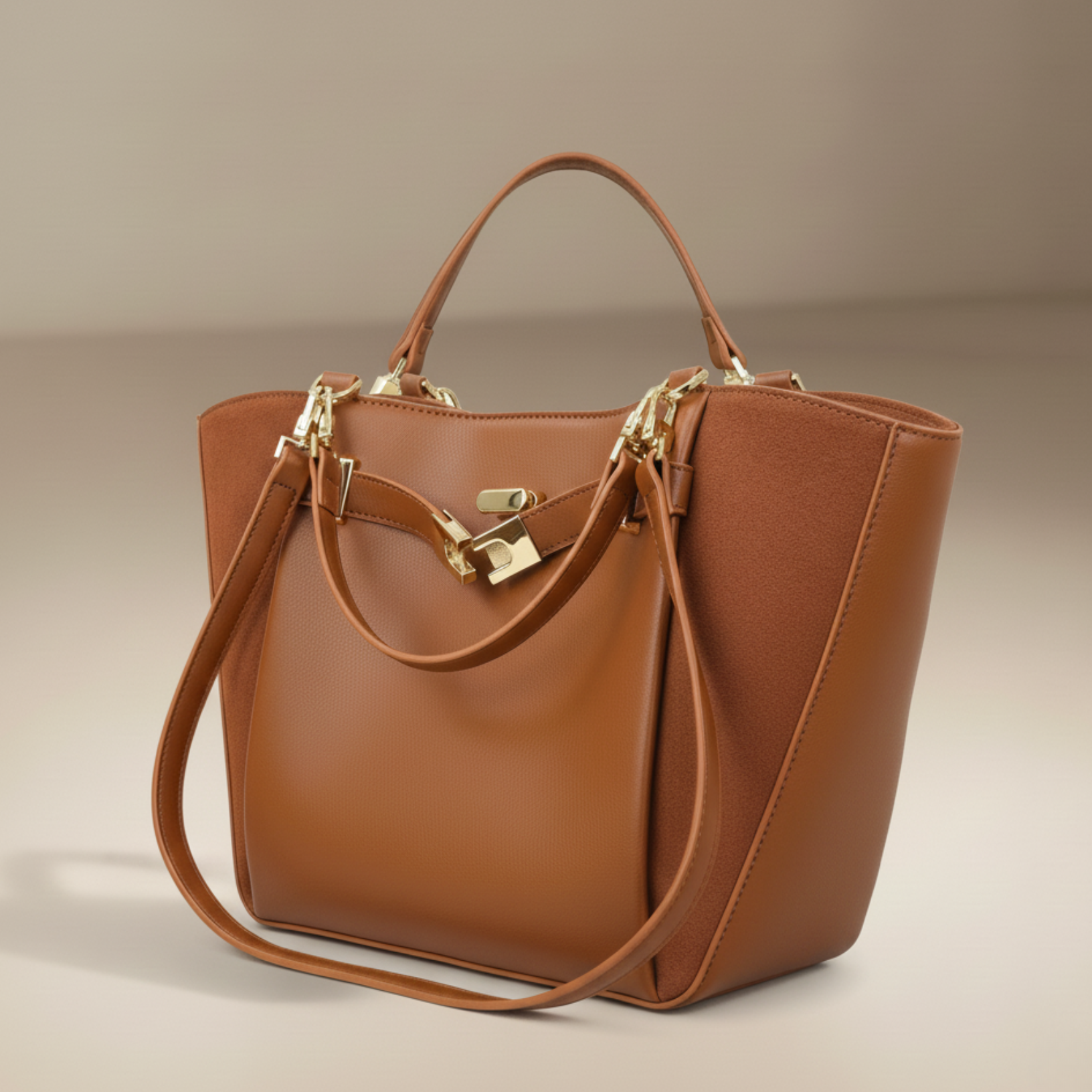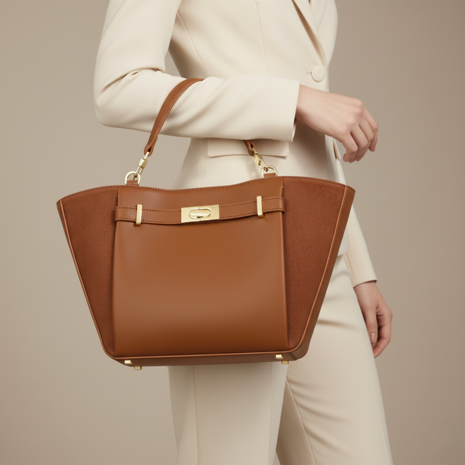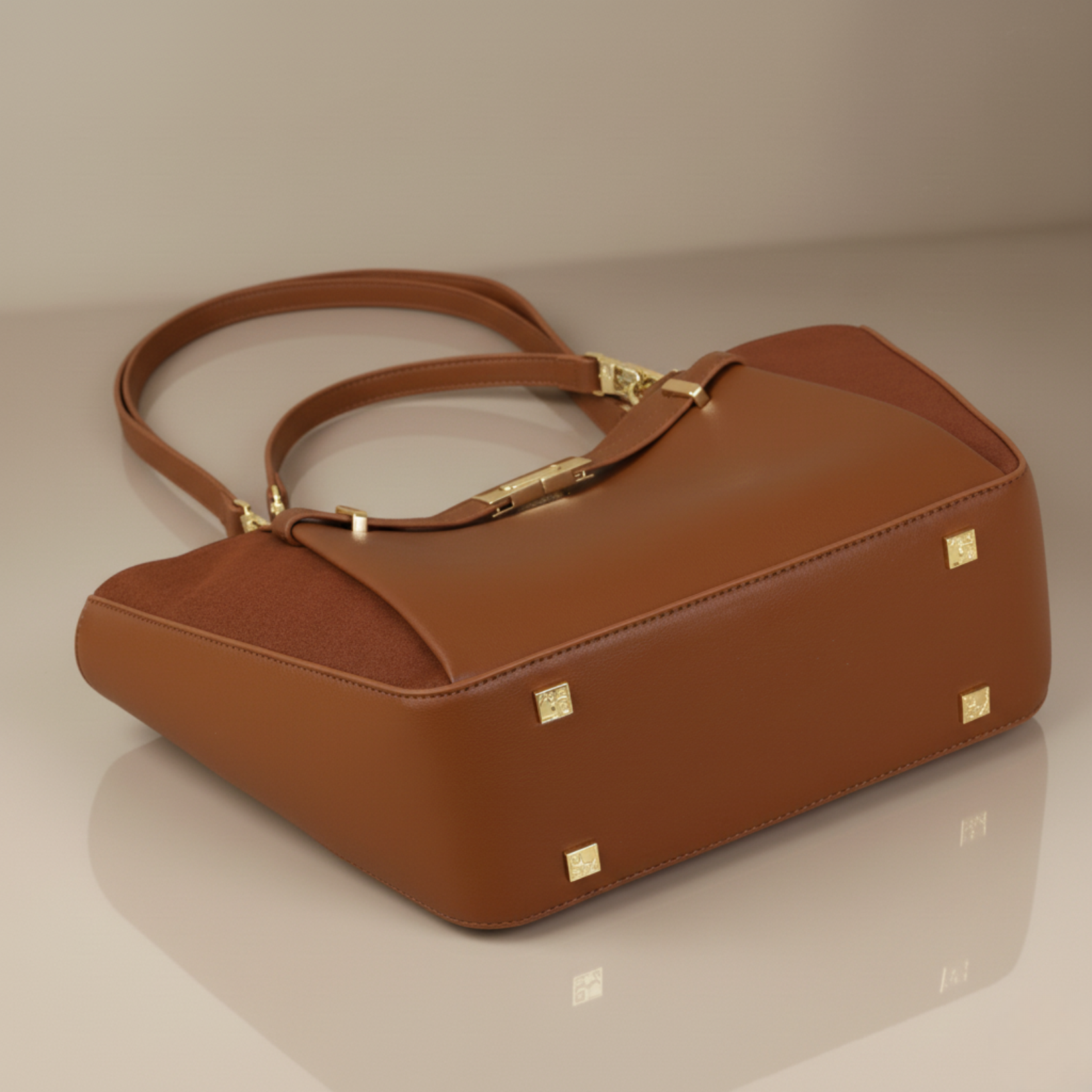 The structured top handle adds presence, while the detachable long strap offers versatility without compromising the elevated aesthetic. The overall composition — clean, intentional, refined — reflects a design built from thoughtful details.