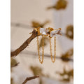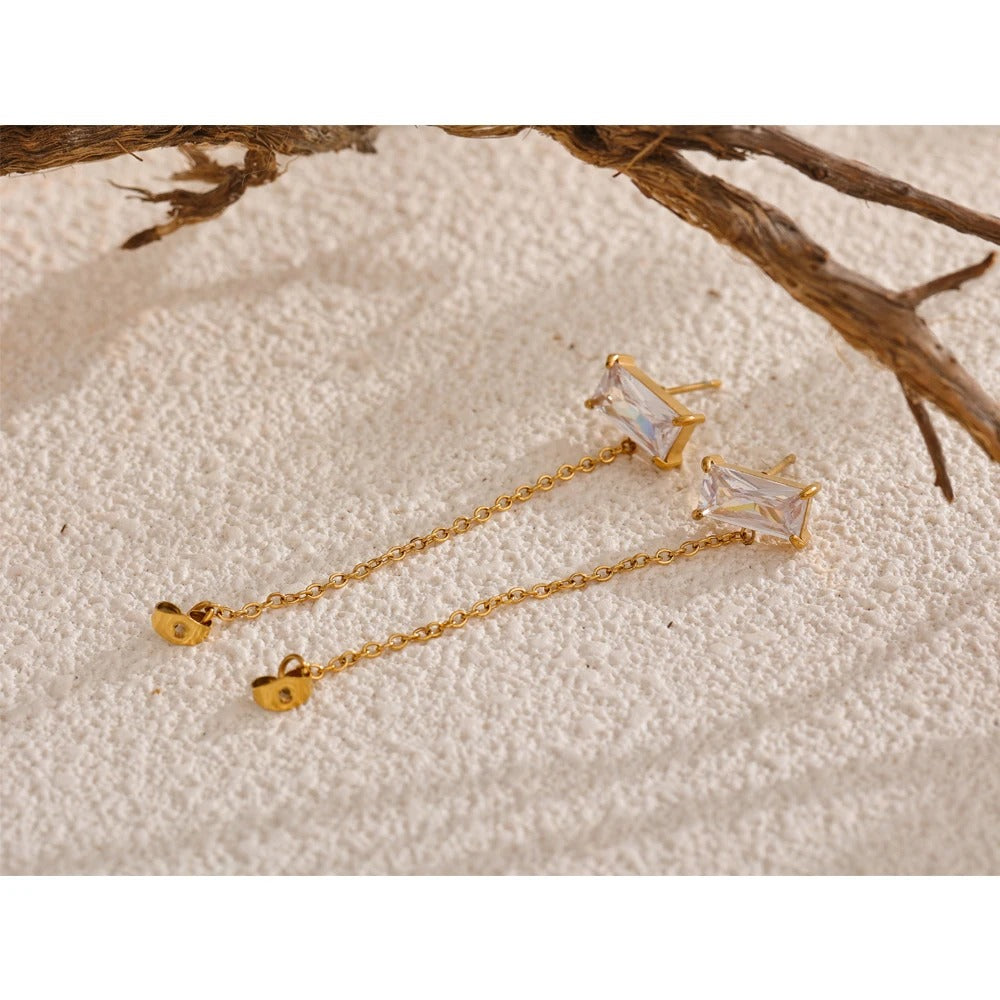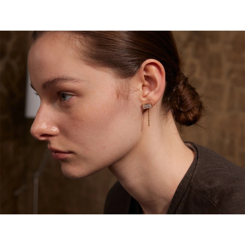 Clean light with a bold wink. Gold-plated earrings feature a horizontal baguette crystal linked by a slim chain—tracing the lobe, lengthening the neck, effortlessly alluring.