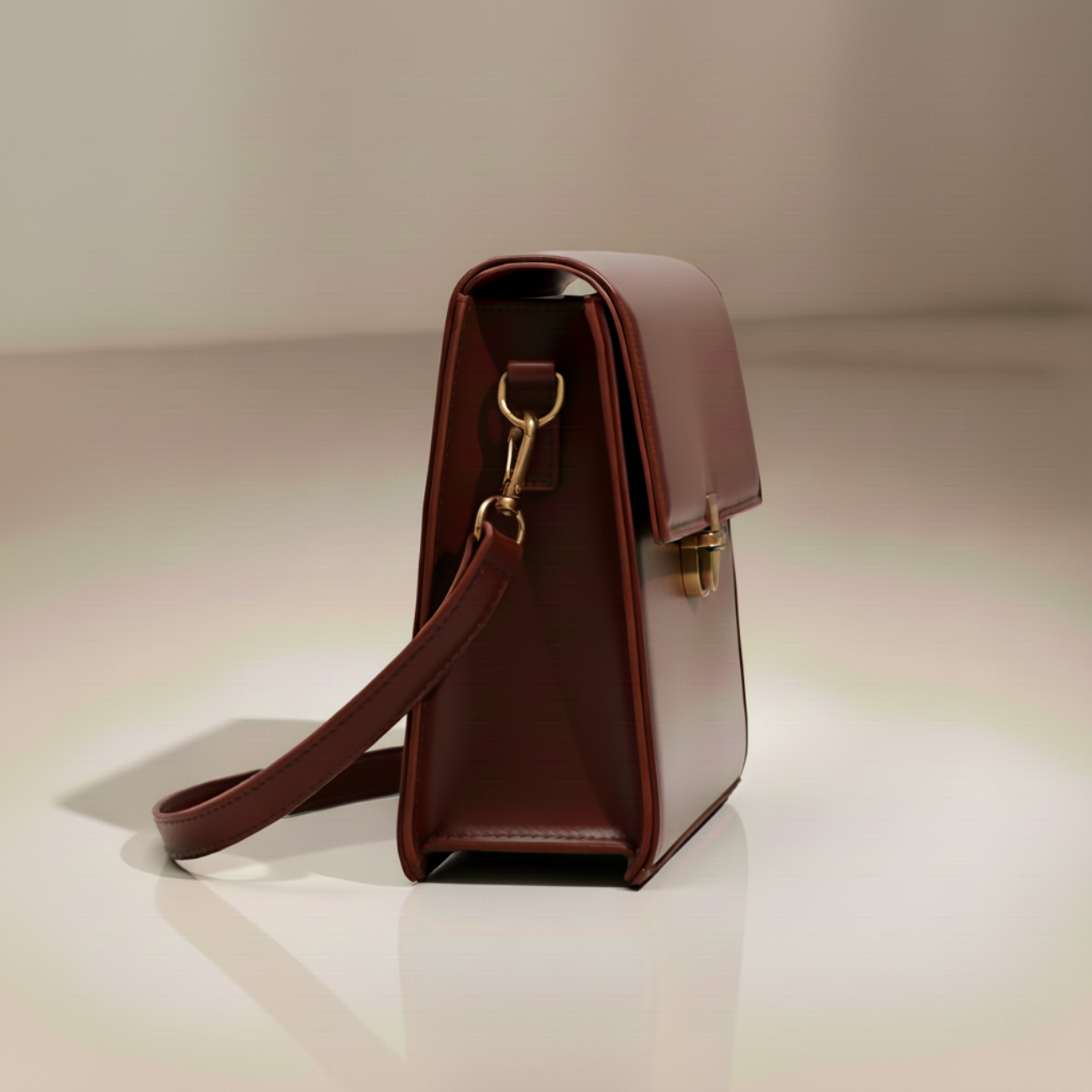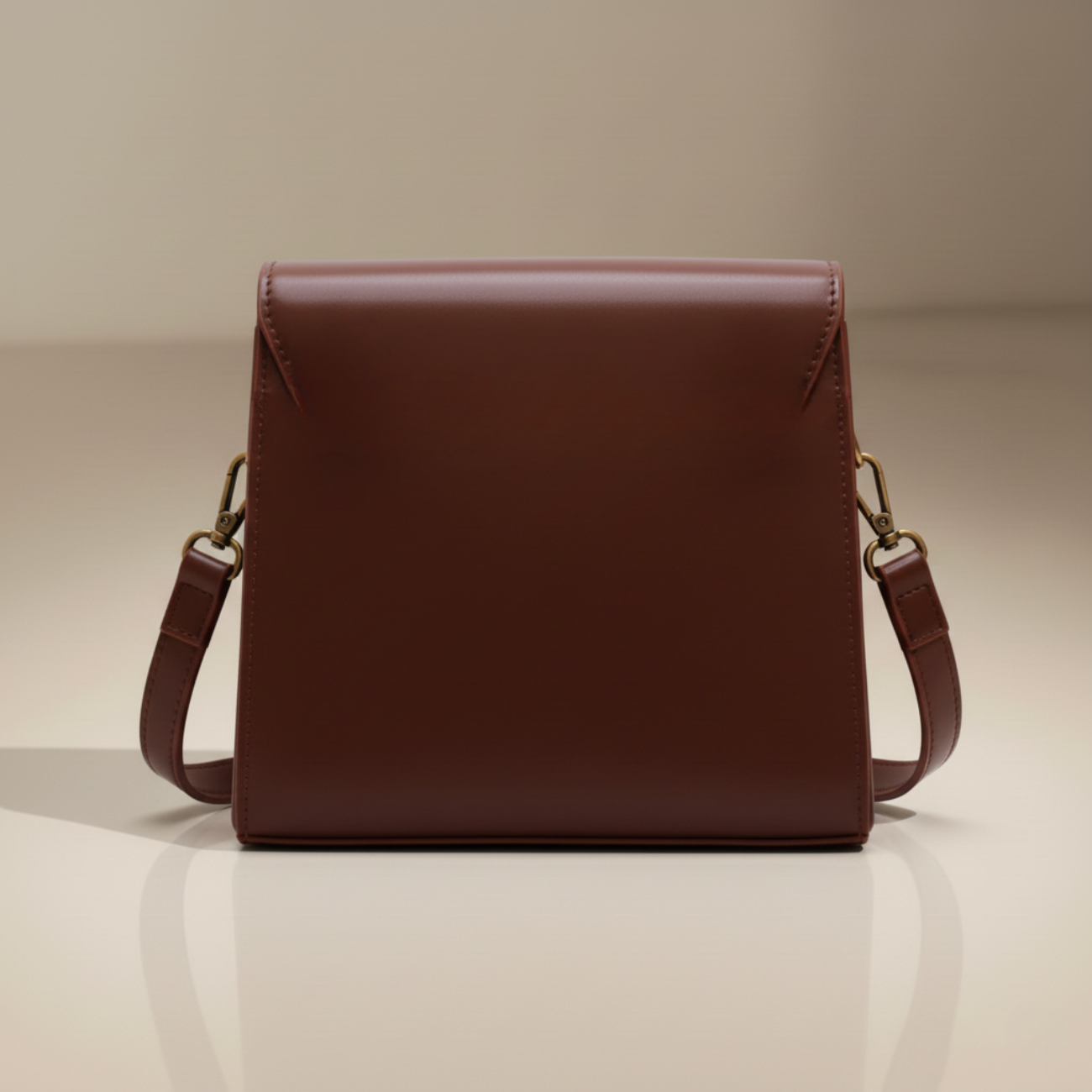 A geometric silhouette defined by clarity and proportion. The warm chestnut hue contrasts beautifully with the soft luster of antique brass hardware, while the squared flap closure reinforces the bag’s sculptural integrity.