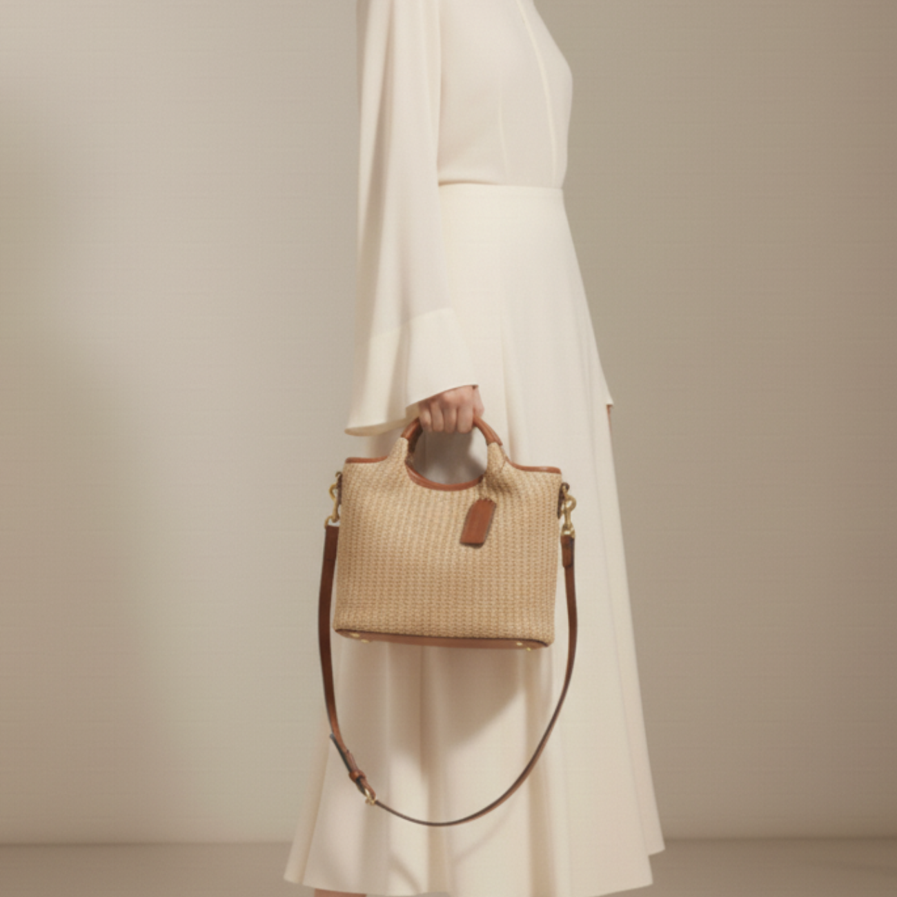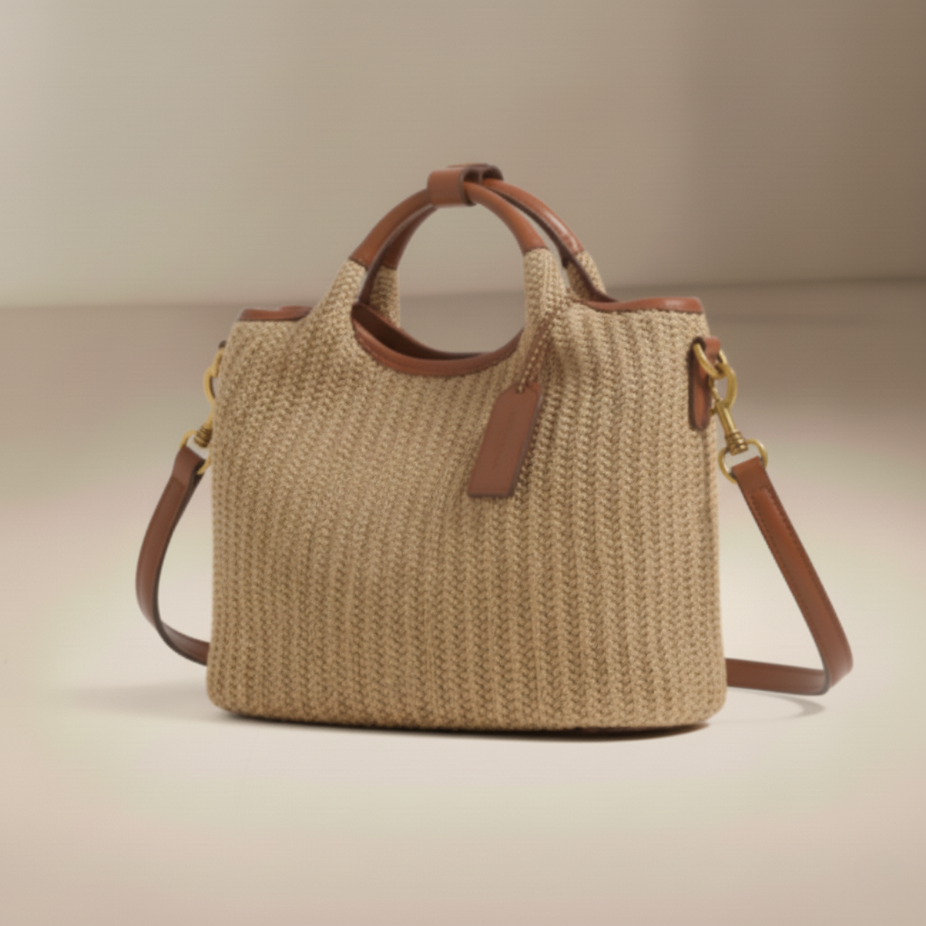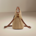 An elevated reinterpretation of artisanal weaving. Its sculptural silhouette is balanced by rich tonal contrasts — the warm beige body paired with cognac leather trims evokes relaxed elegance.
