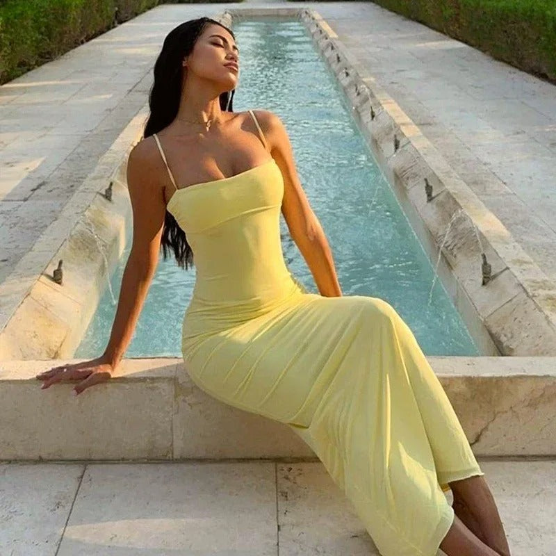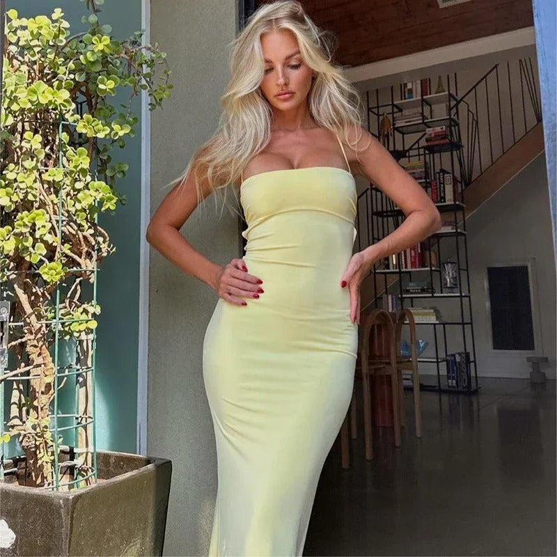 Estilo : Vestido longo justo com alças finas e detalhe nas costas abertas