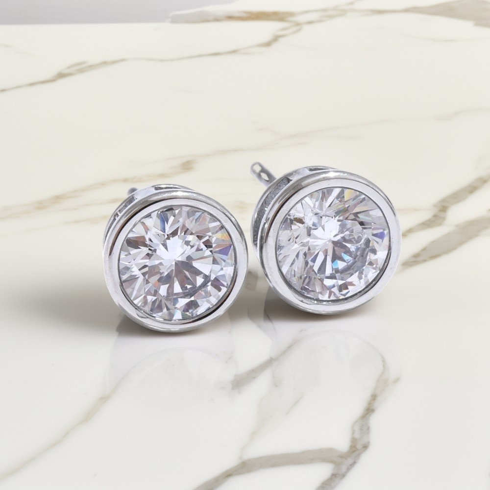 Quiet light, crisp outline. Round brilliant crystals sit in smooth bezels on posts of gold or silver-plated metal—sleek, luminous, effortlessly alluring.