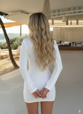 This crochet-knit small dress embraces the body with a plunging front tie detail, highlighting the neckline while tracing a sleek, elongated silhouette. Lightweight and alluring, it moves seamlessly from sunlit beach strolls to golden-hour cocktails.
