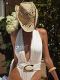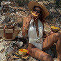 This monokini embodies effortless beachside elegance with a sensual edge. The plunging neckline and fluid draping sculpt the body with graceful movement, while the high-cut design elongates the silhouette — perfect from sunrise lounging to sunset cocktails.